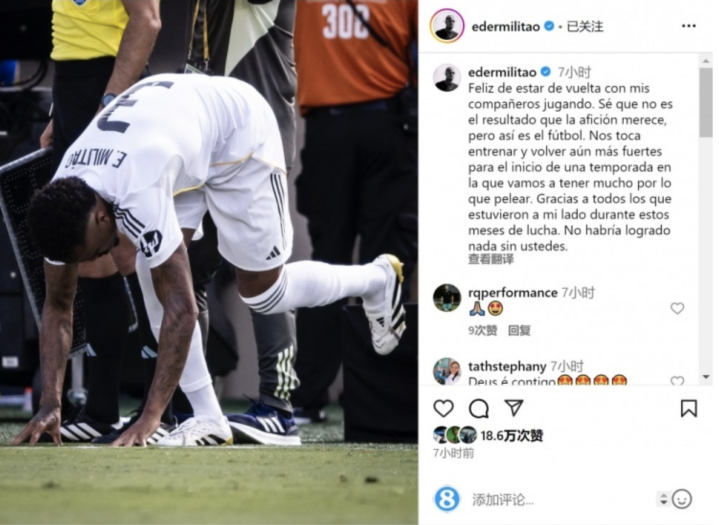 米利唐晒出自己替补上场时的照片,字里行间满是重回赛场的喜悦:“能回到赛场与队友并肩作战,我打心底里高兴。我清楚这场失利不是球迷们所期待的,可这就是足球,充满变数。” 今年1月,米利唐在与奥萨苏纳的比赛中右膝前交叉韧带撕裂,历经漫长康复期,此次世俱杯半决赛是他时隔8个月再度踏上球场。尽管球队大比分落后,比赛局面艰难,但他仍积极投入,在有限的出场时间里贡献了多次关键防守。